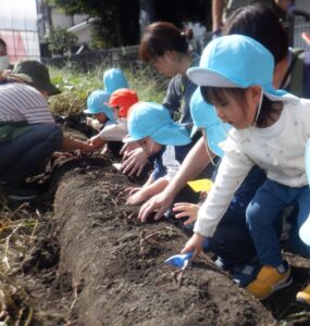 いろいろな収穫を経験しているりす組さんは、「お芋掘りいくよ〜!」と朝から張り切っていました。