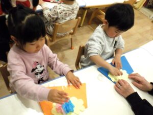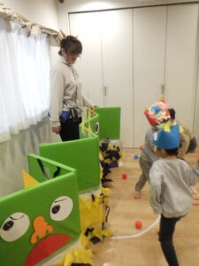 ひよこ組さんは、豆入れにボールをたくさん入れてみたり、鬼に向かってポンっと投げてみたりと、豆まきの雰囲気を味わう姿が見られました。